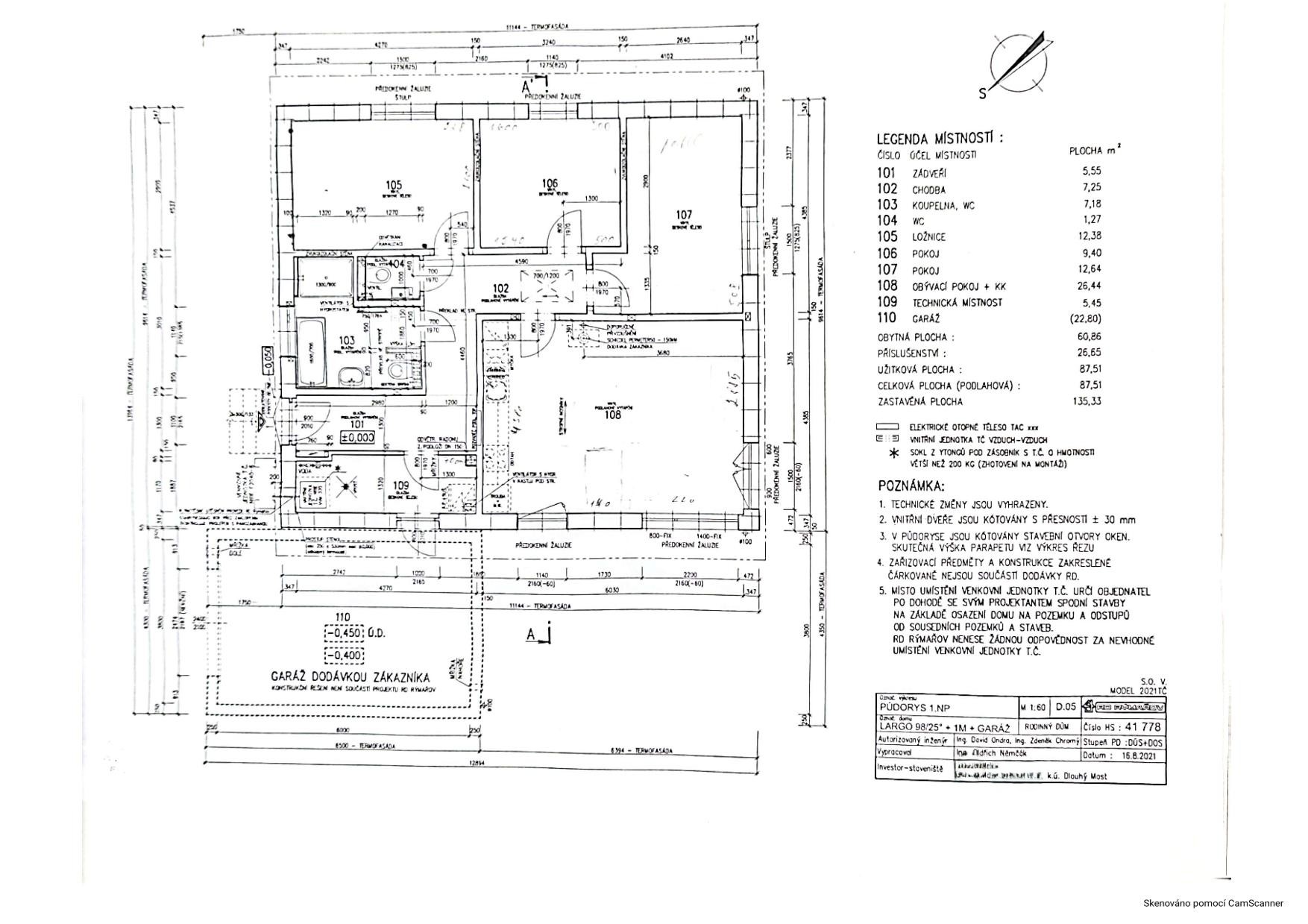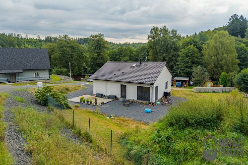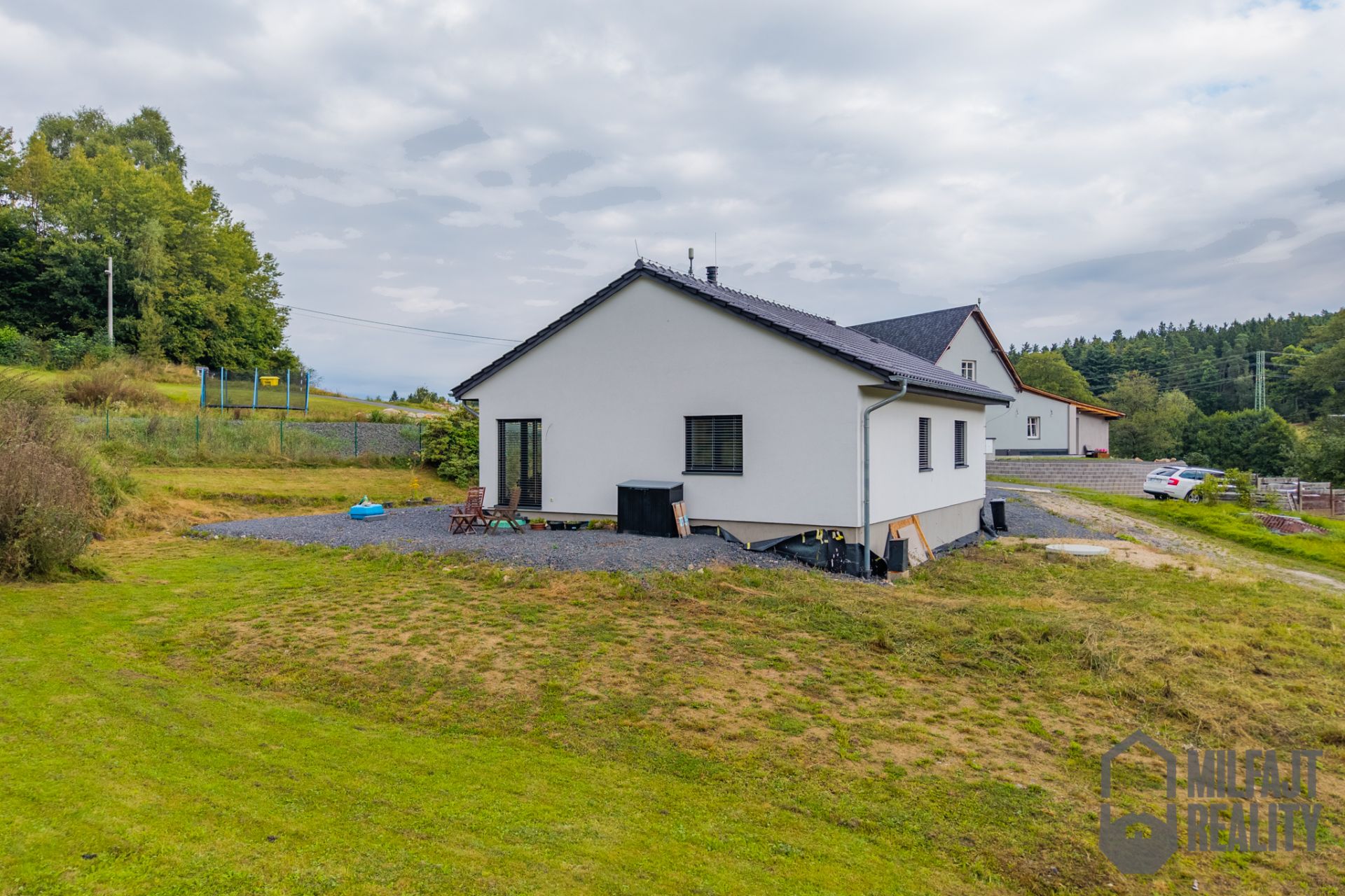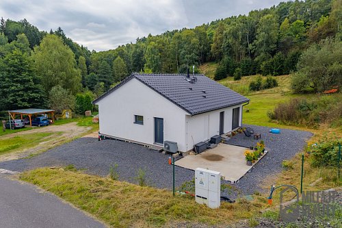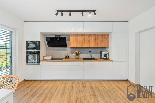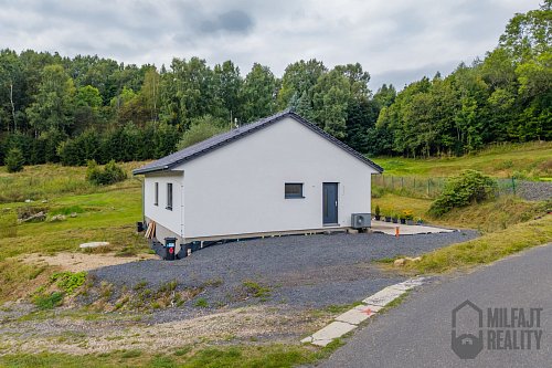 Rodinný dům typu bungalov, nabídne dispoziční řešení 4+kk, které na ploše cca 87 m2 podlahové plochy, ideálně vyřeší potřeby rodiny se 2 dětmi. Je velmi chytře řešen. Paní majitelka si tento dům navrhovala pro své vlastní bydlení v minimalistickém, praktickém a moderním stylu. Nechybí ani úložné prostory, které se nachází v půdním prostoru po celém půdorysu domu.