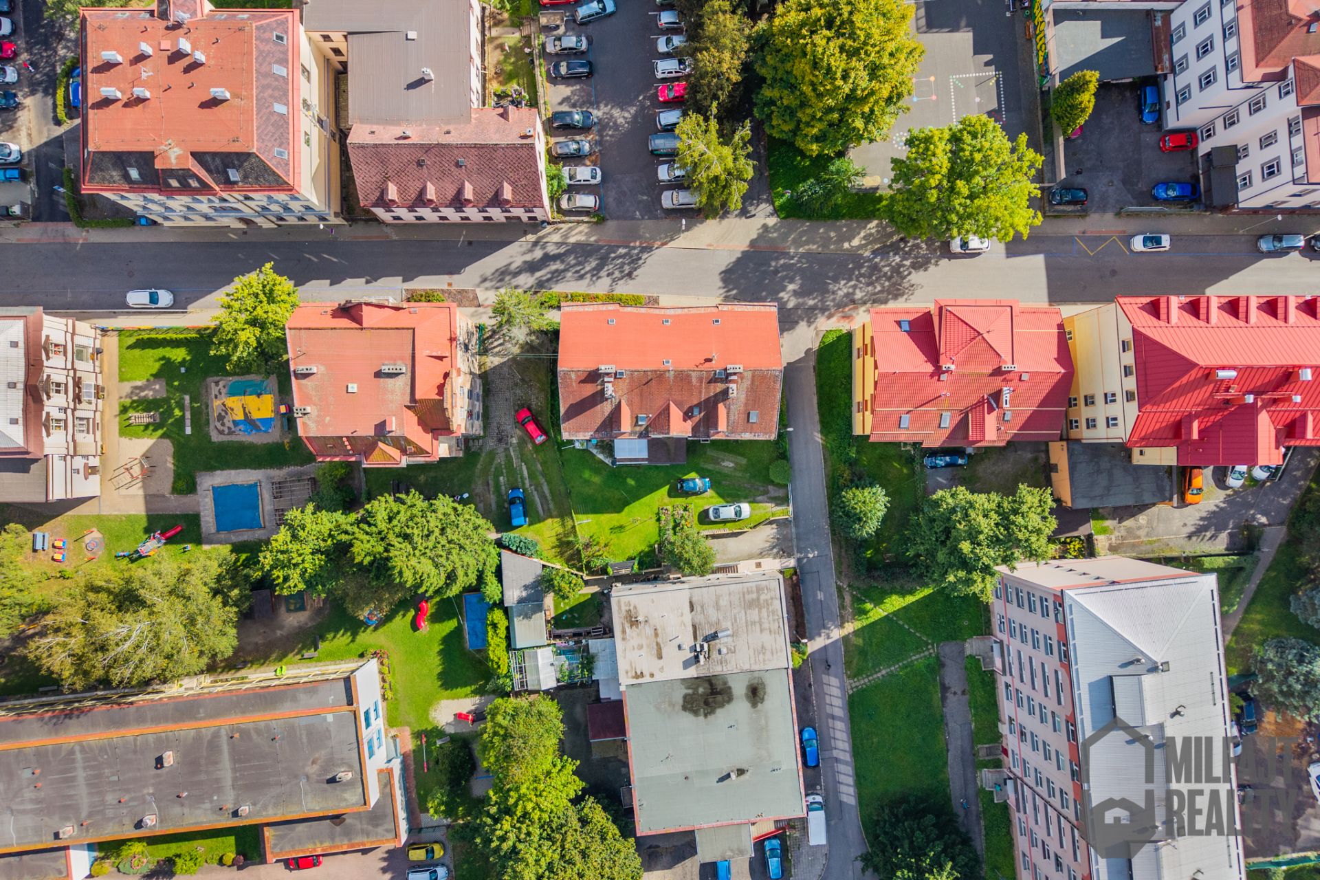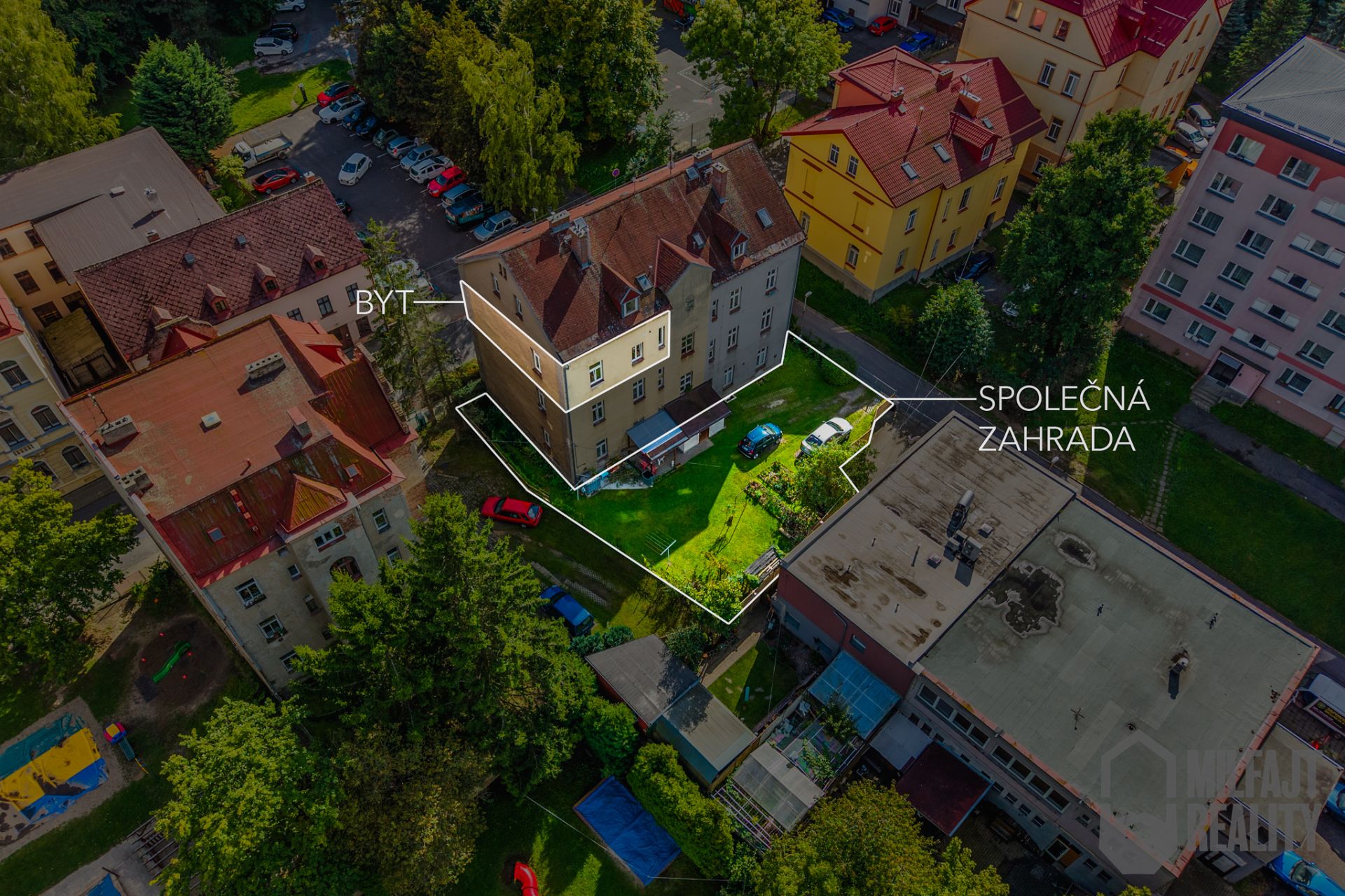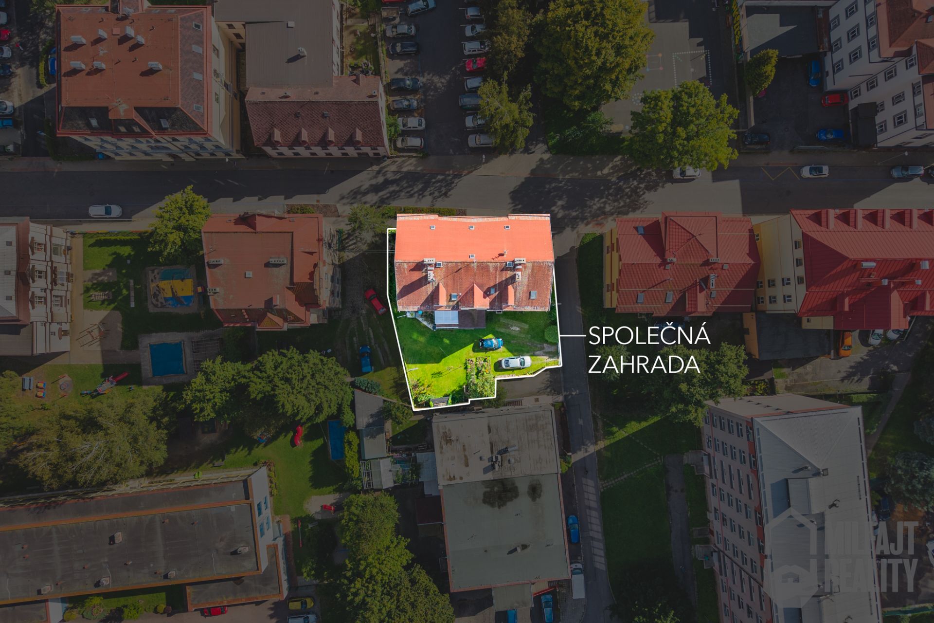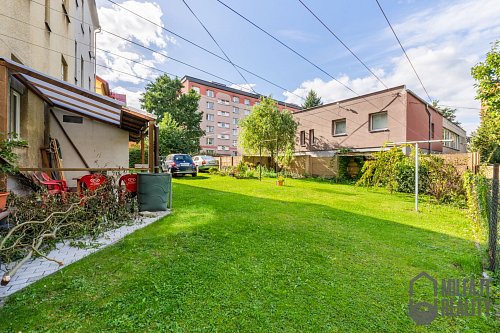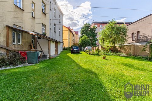 Ať potřebujete školku nebo školu, supermarket, kavárny, zastávku MHD či obchodní centrum, to všechno máte pár kroků od domu. Mít všechno takto po ruce velmi zpříjemňuje bydlení. Zároveň je dům dostatečně stranou od hlavní komunikací a je tu klid, to platí i o zahradě za domem, která je ke společnému užívání všech obyvatel. Zároveň je možné tu za parkovat jedno auto. Další parkování je přímo před domem na komunikaci.