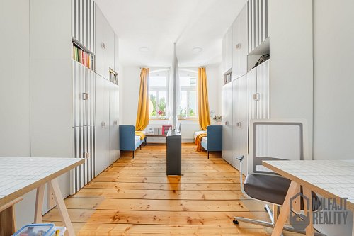 Byt byl původně řešen jako 2+1 s výměrou 87 m2. Tato výměra je dostatečné pro současné využití jako 3+kk a zároveň se nabízí další možná úprava dispozice. Pokoj, který nyní slouží jako ložnice a pracovna s rozměry 5,5 x 5,5 metru, nabízí možnost dalšího rozdělení.