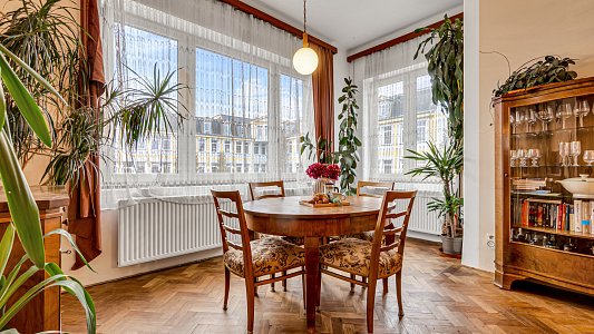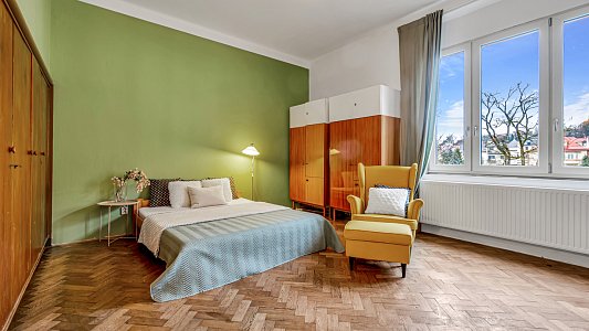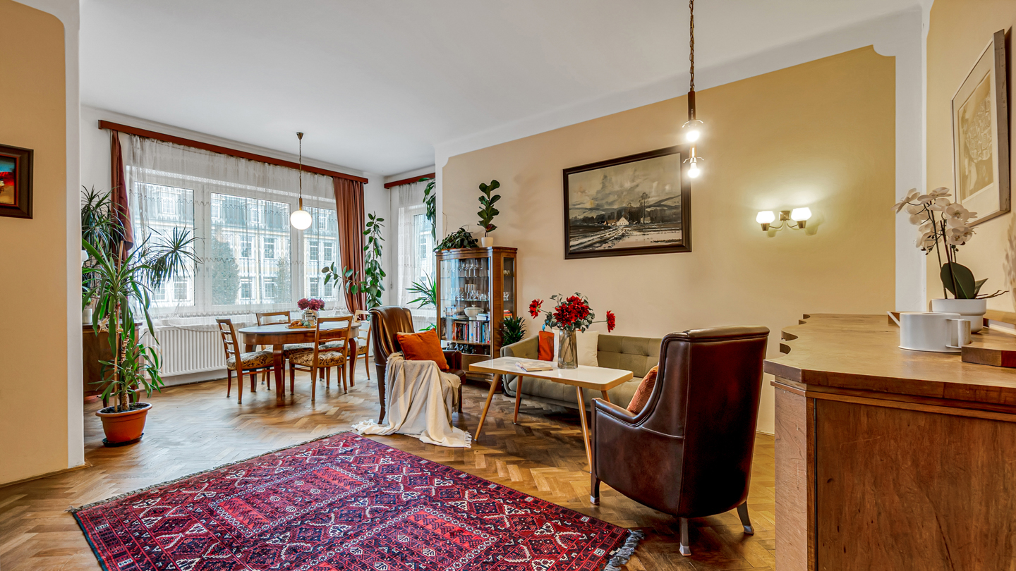 Kdy pokoje jsou orientovány východně do ulice a obývací pokoj je jižním směrem. Celému bytu vévodí vysoké stropy a velká okna, která podtrhují vzdušnost a světlost interiéru.
