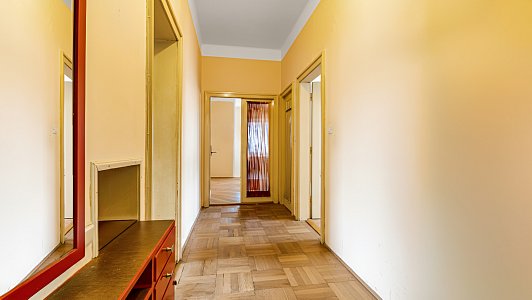 Dispozici bytu definuje hlavní chodba a 3 neprůchozí pokoje + prostorný obývací pokoj.